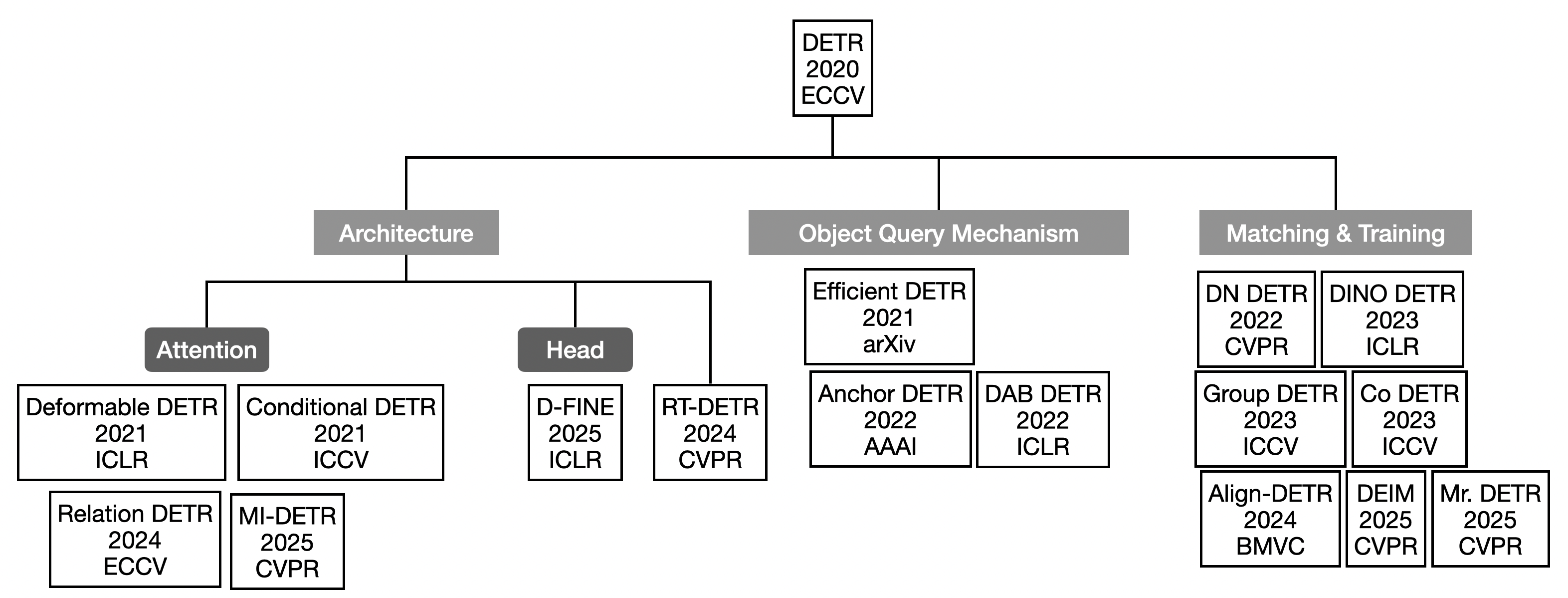 전체적으로 보면, DETR 계열의 발전 방향은 Object Query (입력 설계), Transformer Architecture (Attention 및 Decoder 구조), 그리고 Matching Mechanism (Loss 및 학습 전략) 의 세 축으로 구분하여 이해할 수 있다.