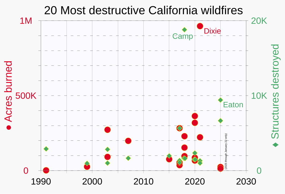 아래 그래프1는 캘리포니아 역사상 가장 심각했던 20건의 산불을 연도별로 정리한 것으로 두 가지 지표를 함께 나타내고 있다.(빨간색은 화재로 인해 소실된 면적을 나타내고 초록색은 파괴된 건물수를 나타낸다.)